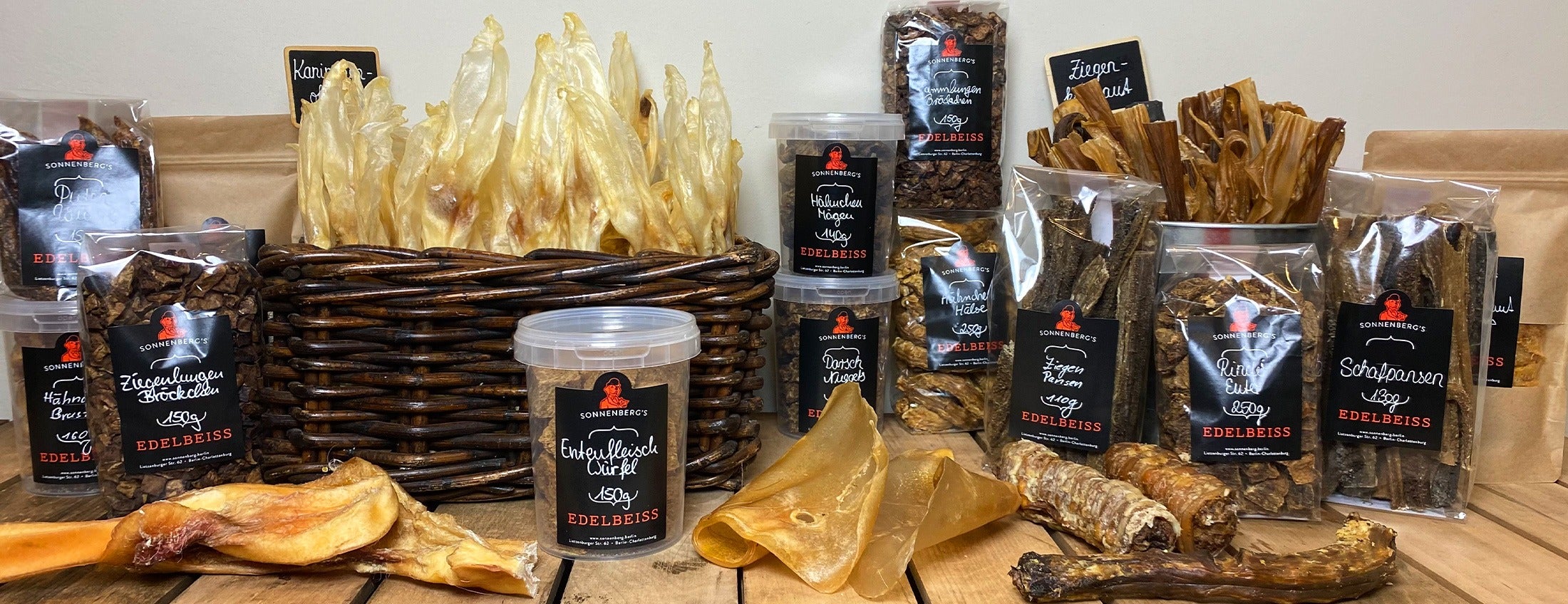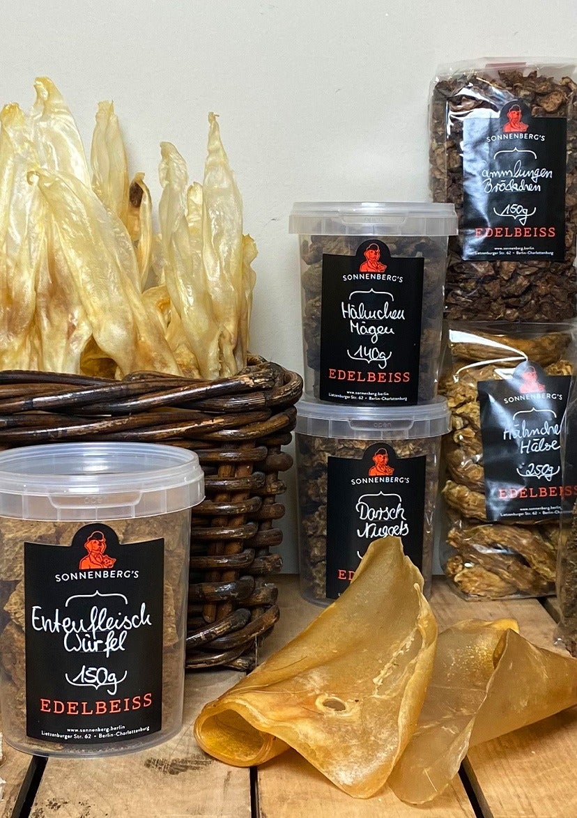 Unsere Hausmarke EDELBEISS bildet den Kern unseres kuratierten Futter Sortiments. Die Kauartikel und Snacks für Hunde und Katzen werden auf natürliche Art und Weise durch Trocknung haltbar gemacht. Es werden keinerlei Konservierungsmittel oder Ähnliches bei der Herstellung verwendet. Somit sind die Snacks absolut absolut gesund und können bedenkenlos gefüttert werden.