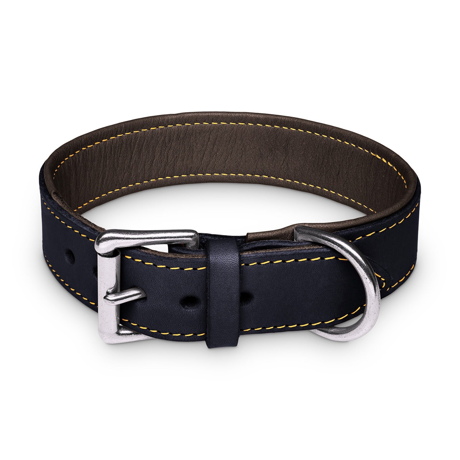 Unsere Halsbänder bestehen aus einem stabilen pflanzlich gegerbtem Oberleder vom Rind oder Büffel und einem weicheren Futterleder. Beides kann farblich nach eigenem Geschmack kombiniert werden. Dazu kommen die verschiedenen Farben der Nähte. Abgerundet wird das persönliche Halsband durch Metallteile aus Messing oder Chrom.