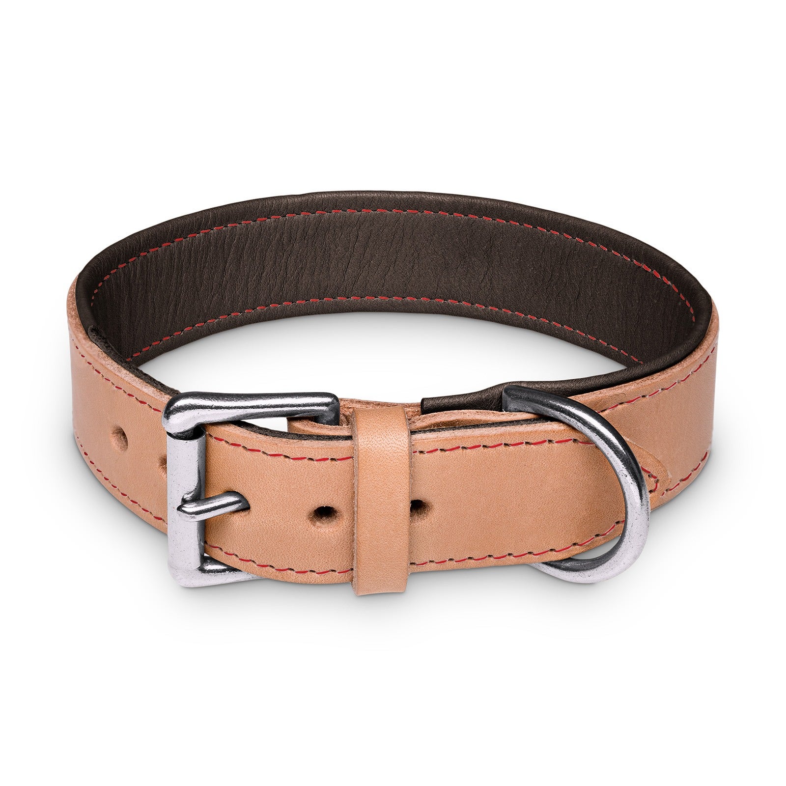 Our collars are made of a sturdy vegetable-tanned cowhide or buffalo upper leather and a softer lining leather. Both can be combined in color according to your own taste. Add to that the different colors of the seams. The personal collar is finished by metal parts made of brass or chrome.
